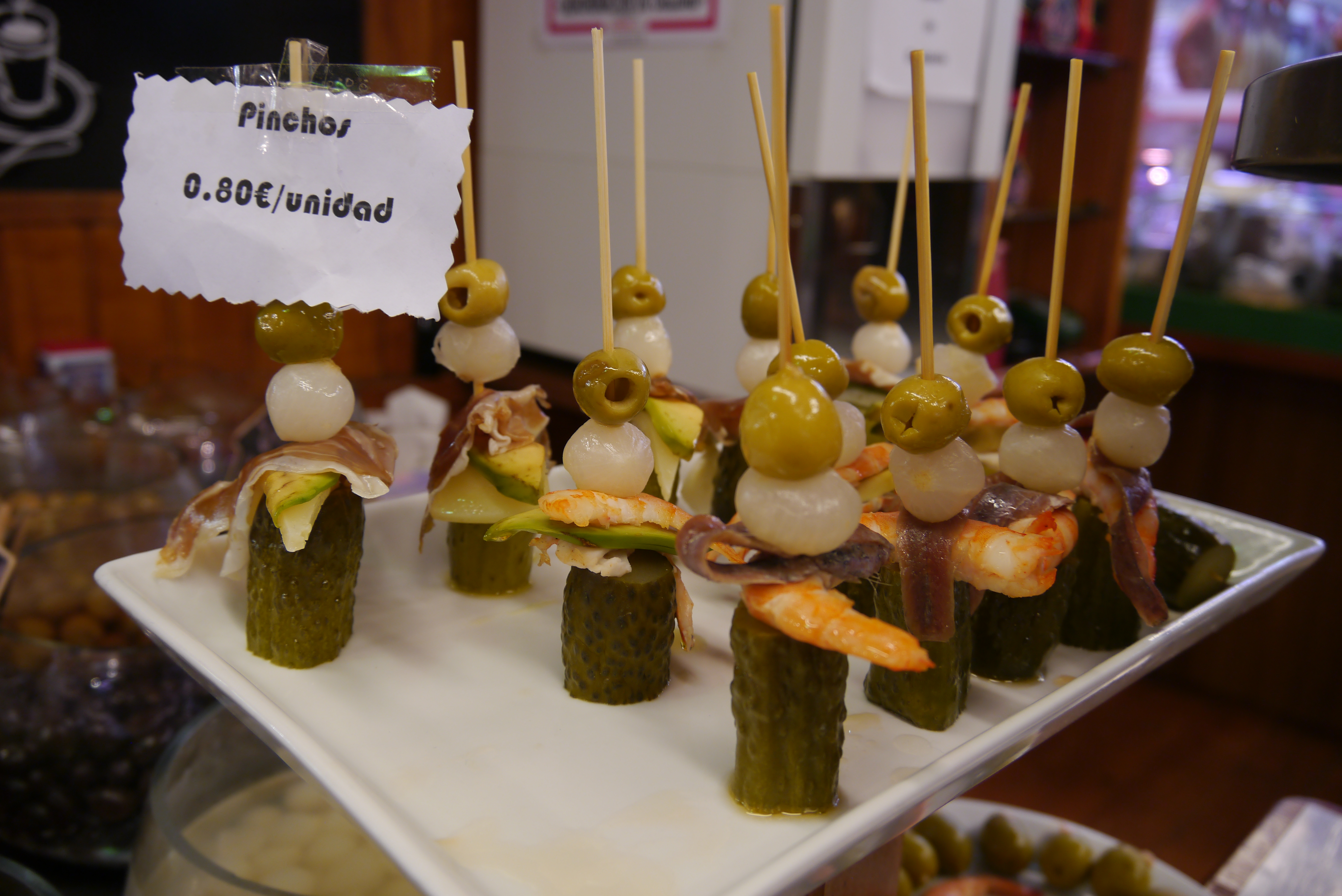 If you are looking for the butchers, the delis, fruit and veg, bread or pulses – you need to go upstairs. My favourite stand up on top is the olive stand. It’s only been open for five months but I think it’s a stayer. For 80 cents (1 US dollar or 65p) you can get a tapa on a skewer including a half gherkin, spring onion, slice of avocado, one whole anchovy, a slice of manchego cheese and a piece of jamon or a prawn. There is no way you could make this yourself for cheaper. I usually buy two and scoff them at home or in the office.