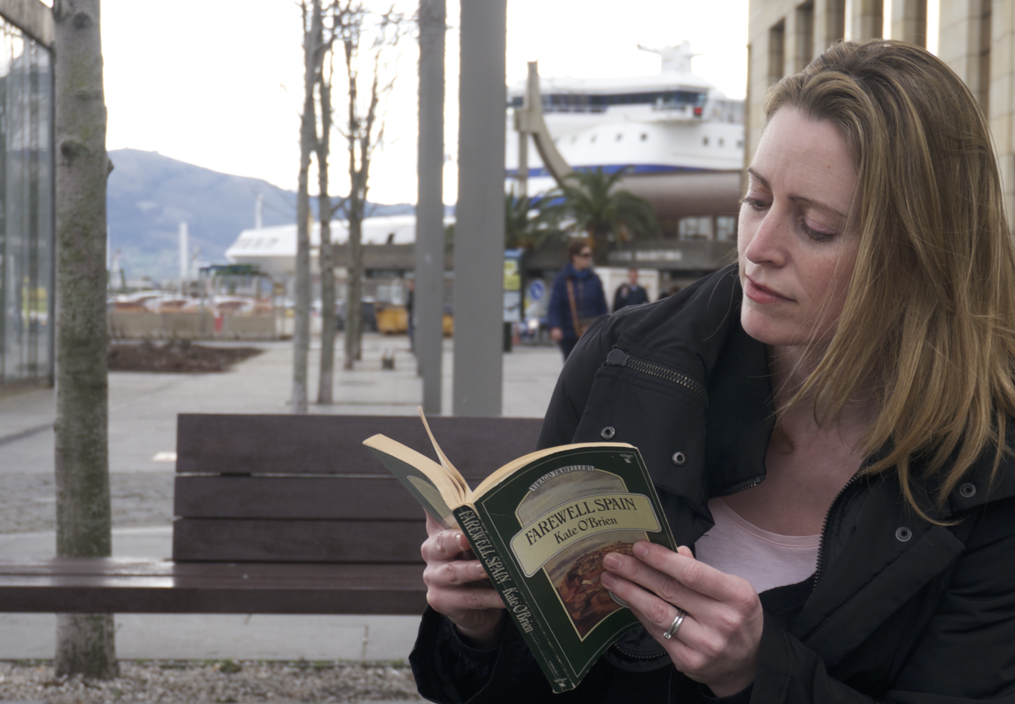 Here I am re-reading my copy of  ‘Farewell Spain’ on a bench outside the post-office with a ferry in the background…