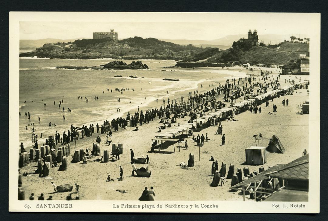 Wonderful photo showing how undeveloped the far side of  the Sardinero area was. And the windbreakers or changing cubicles were quite nice too! If you go today, you’ll still see lots of people walking the water’s edge. The Three Beaches of the Sardinero: La Concha, Primera Playa and Playa Castañeda. Photographer: Lucien Roisin Besnard. Taken between 1925 & 1932. The Victor del Campo Cruz Collection. © Centro de Documentación de la Imagen de Santander. Ayuntamiento de Santander