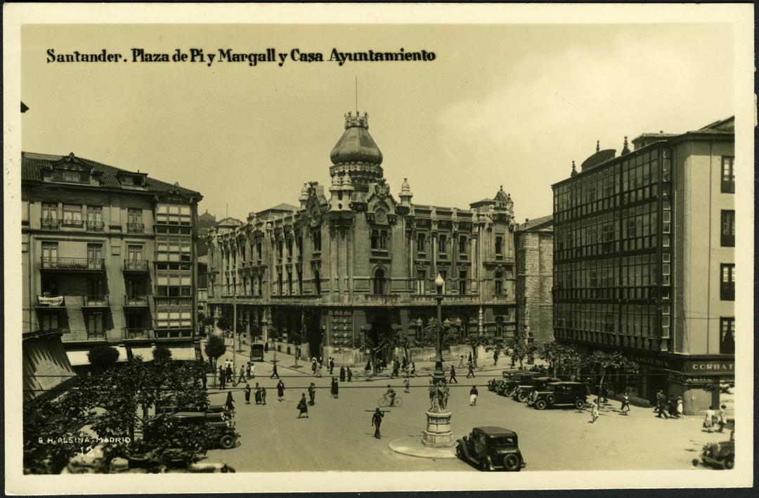 I had to scratch my head quite a bit to work out where this was taken because the street names have changed and the church to the right of the town hall has been consumed by the town hall itself. Plaza de Pi y Maragall & The Town Hall. Photographer: GH Alsina. Taken 1935. Victor del Campo Cruz Collection. © Centro de Documentación de la Imagen de Santander. Ayuntamiento de Santander