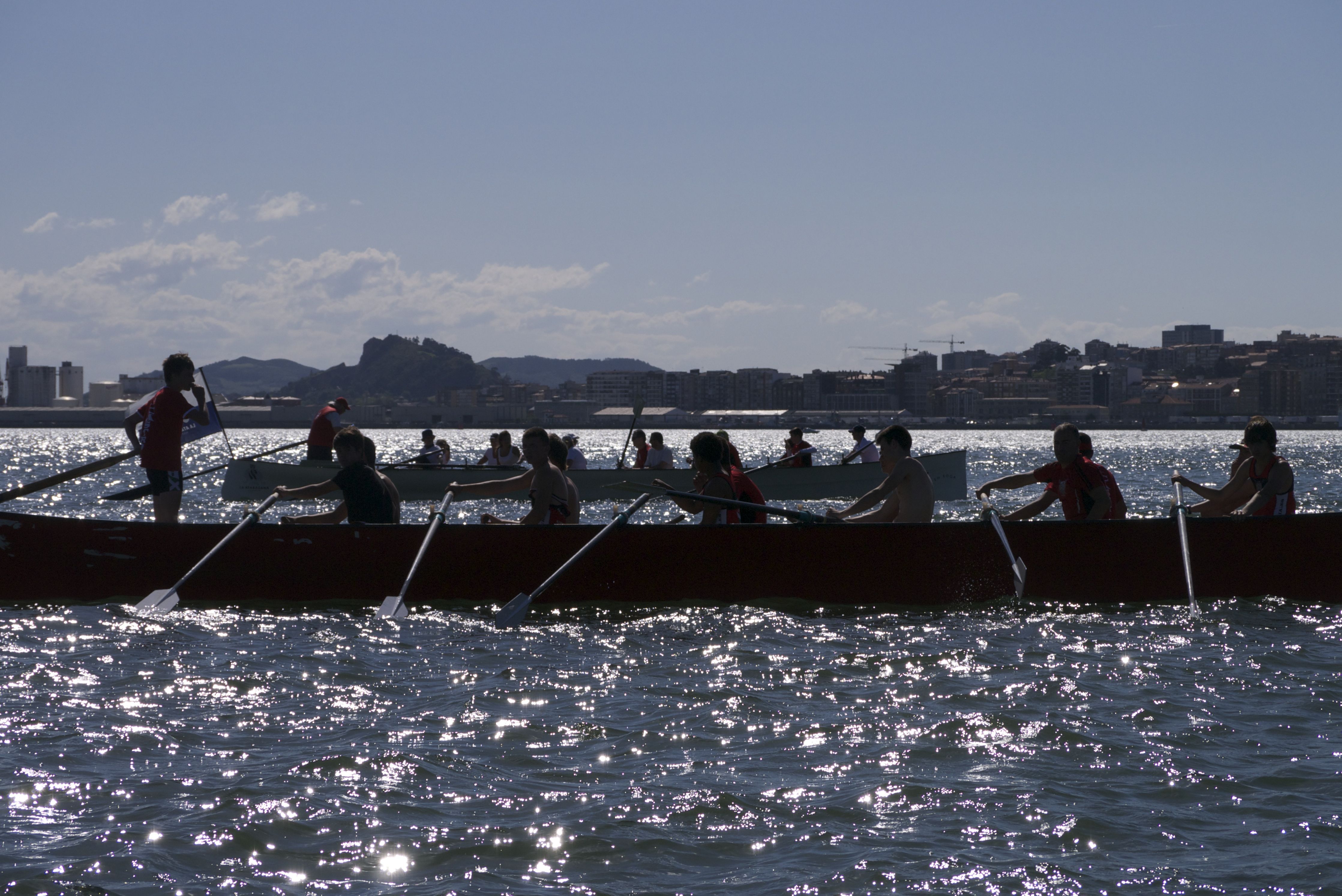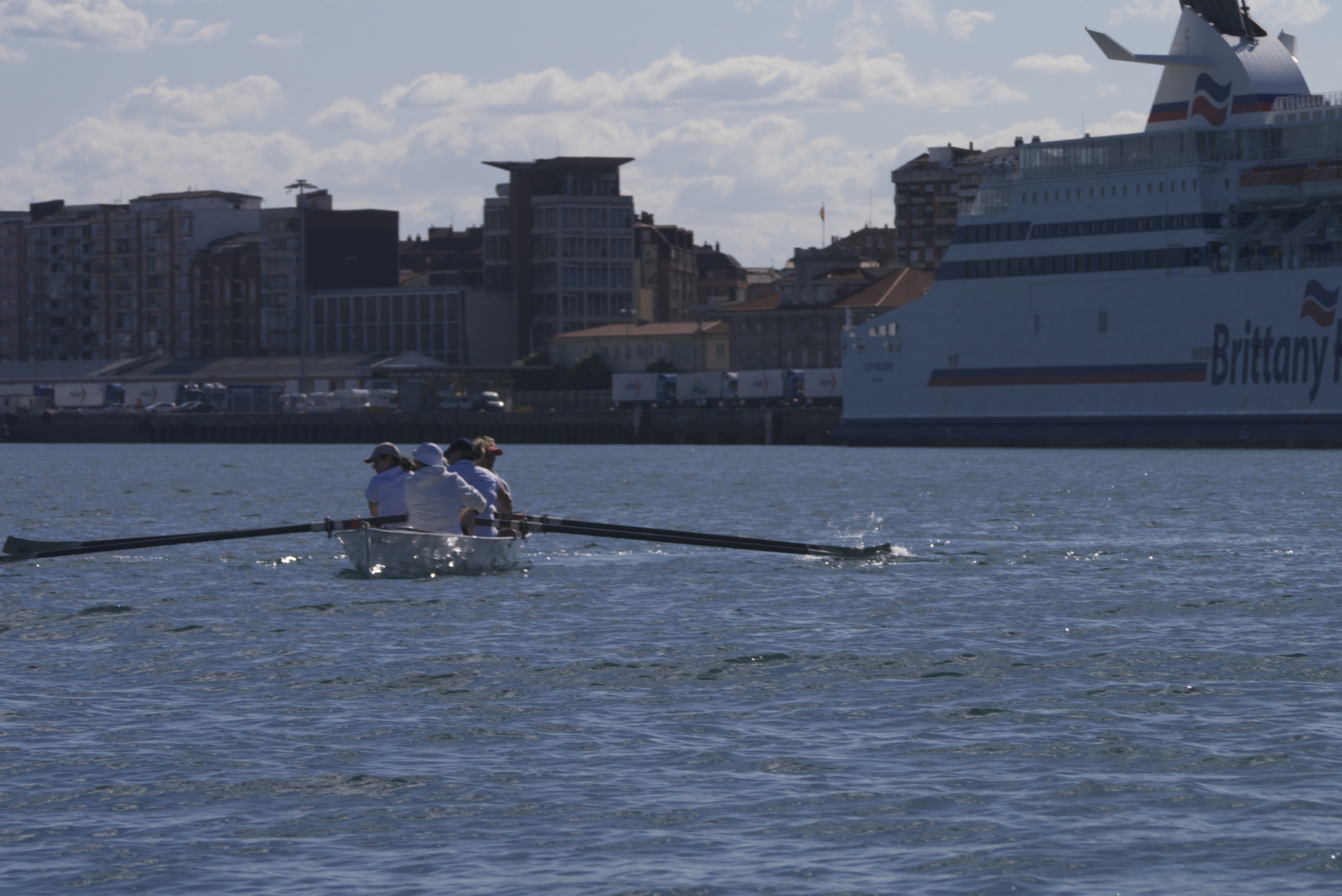 The red trainera with the Castro kids on board. See the Brittany Ferries ship in the distance? The passenger port is right in the centre of the city