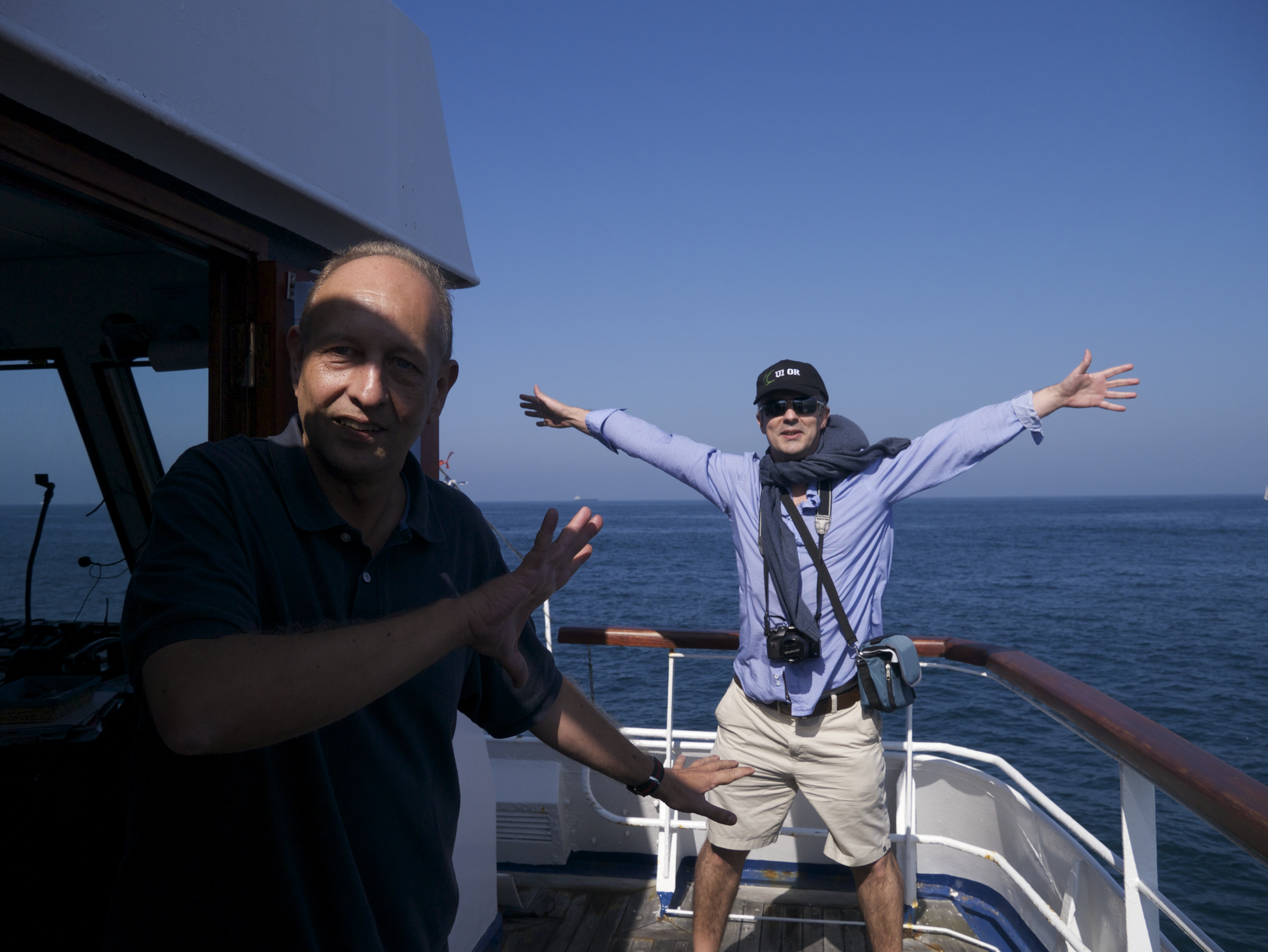 We made our way past the Old Crane and onto the Palacete and it was time to hop on the boat. Before we did Domingo gave us a nice sketch of the layout of the city showing how much of the centre is built on reclaimed land. I circulated a map painted in 1575 to illustrate this also. As we hopped on the boat, I gave everybody a 1958 map of the city of Santander by painter Esteban de la Foz. It was recently reprinted by an organisation I row with called Santander en Boga and it seemed like a nice memento of the city to give to our visitors. I had more maps to share thanks to Pedro but as the Pedrenera boat took leave of the port, and the light flickered on the bay, it felt like time to meet people properly and enjoy sharing the special views over a glass of wine and some great food. The tour of the bay was spectacular and everybody agreed that Santander from the water is a very beautiful sight.