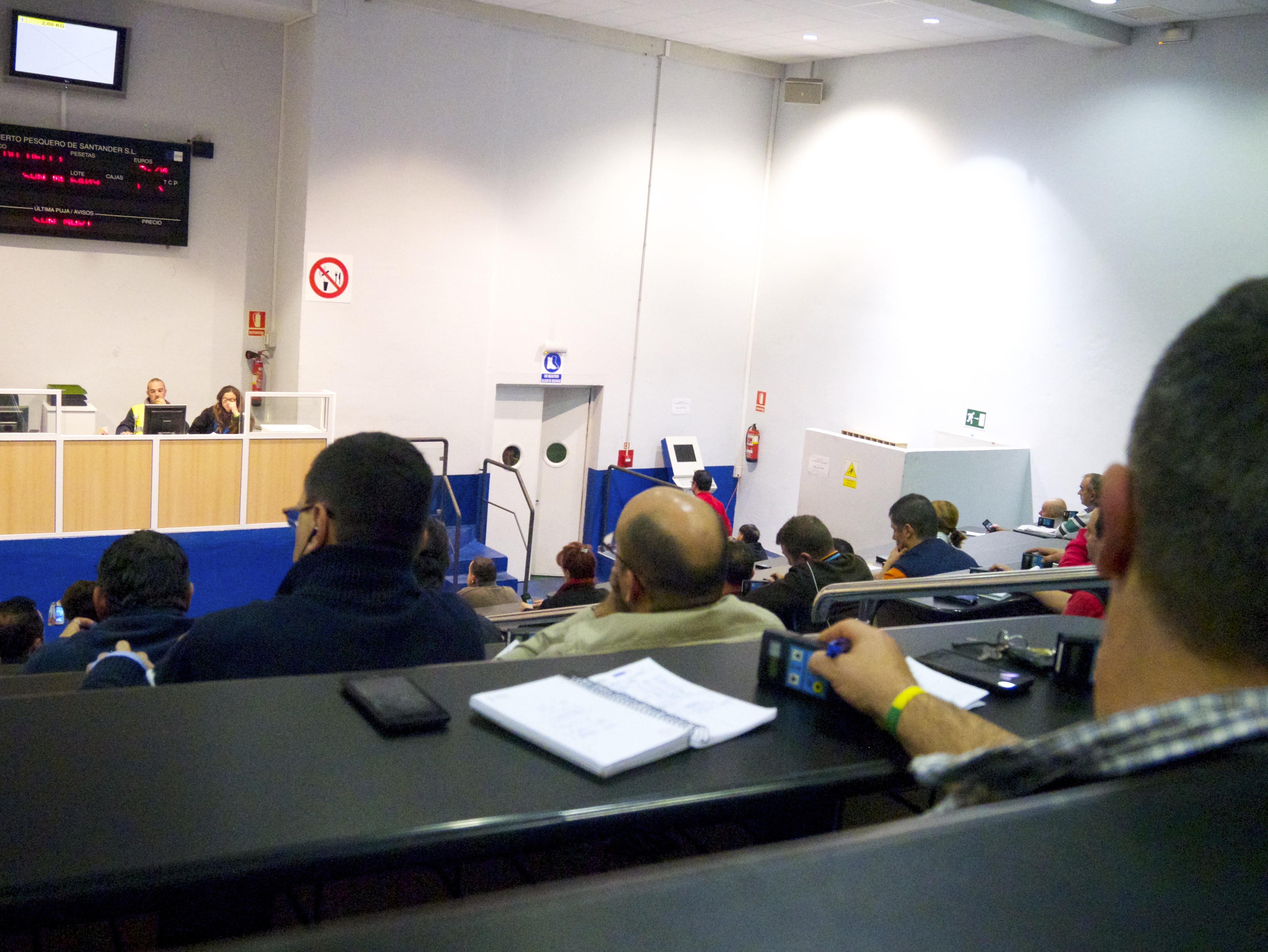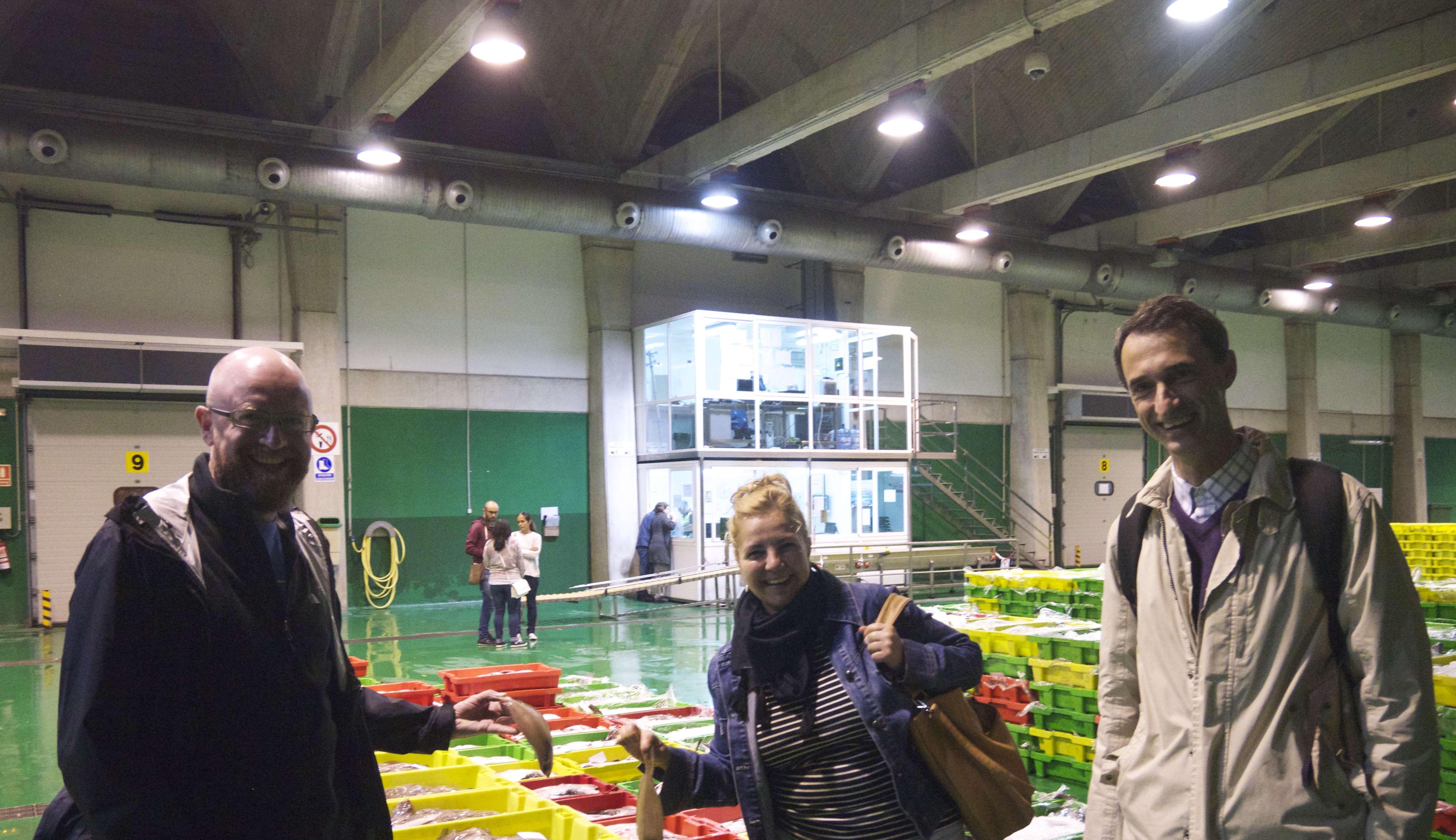 We crept in and went up to the back (behind Marta’s husband Enchi) as discretely as possible. You could hear a pin drop the place was so quiet. This auction operates Dutch style with the price starting high and falling until a bid is made and the item is sold. In the photo below you can see the white screen which shows the images of the fish crates going under auction, the black and red screen below shows the price (as it’s falling) and the name of the successful bidder when a bid or multiple bids are made. The guy in the high-vis jacket is the auctioneer who seeks a nod or some verbal confirmation of each bid from the successful bidder. There’s an element of tension in the room and a sense of competition amongst the buyers but the auctioneer is very relaxed or at least he appears to be with his steady voice and calm manner.